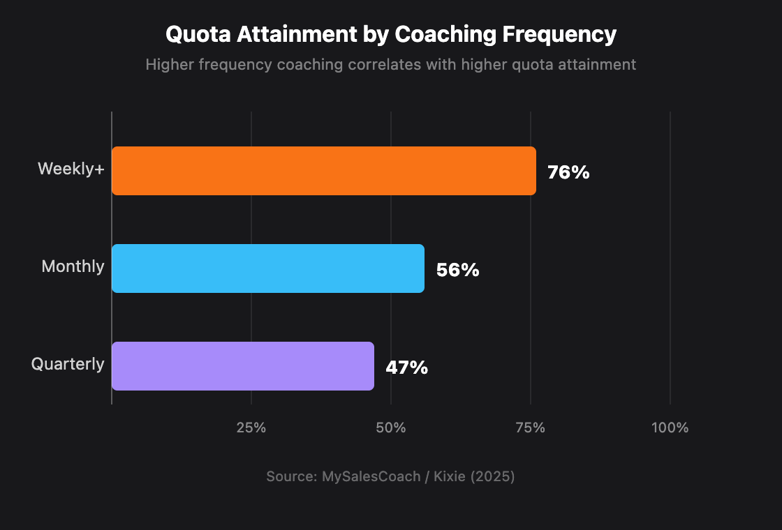 The numbers back this up. Teams coached weekly or more hit 76% quota attainment. Monthly coaching drops to 56%. Quarterly or less? Just 47% (Kixie, 2025). Putting coaching inside the CRM where reps already work makes frequent coaching realistic — not just a nice idea.