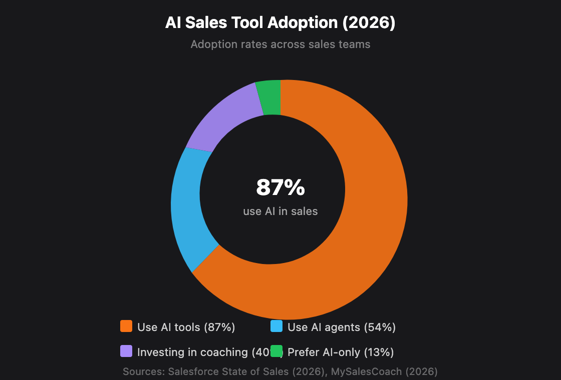 According to Salesforce's 2026 State of Sales report, 54% of sellers have already used AI agents, and high performers are 1.7x more likely to use AI prospecting agents than underperformers (Salesforce, 2026). This signals that AI coaching adoption isn't experimental — it's becoming a competitive requirement.