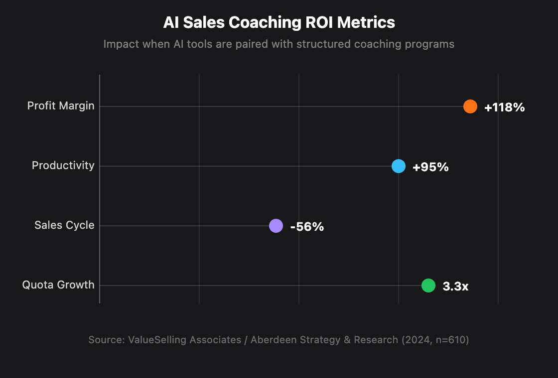 Expect faster deals, higher margins, and better quota attainment — if you pair the tool with real coaching habits. A global survey of 610 sales leaders found that teams combining AI tools with structured coaching saw 3.3x quota growth, 56% shorter sales cycles, 118% higher profit margins, and 95% greater productivity (ValueSelling/Aberdeen, 2024).